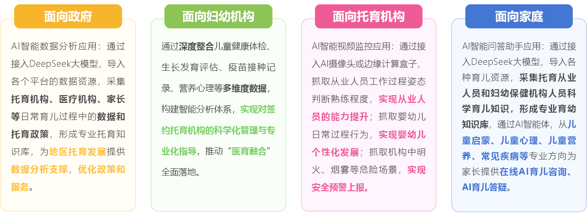 該 AI 應用場景平臺以 DeepSeek 大模型為依托,面向政府、婦幼保健、機構、家庭四大主體,通過整合多源數據與智能技術,提供數據分析、機構管理、視頻監控、在線咨詢等服務,推動托育行業發展。